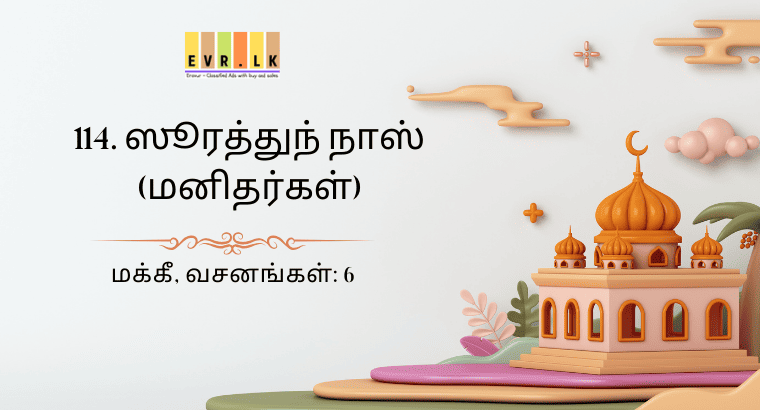 மக்கீ, வசனங்கள்: 6 بِسْمِ اللهِ الرَّحْمٰنِ الرَّحِيْمِ அளவற்ற அருளாளனும், நிகரற்ற அன்புடையோனுமாகிய அல்லாஹ்வின் திருப்பெயரால்(துவங்குகிறேன்) 114:1 قُلْ اَعُوْذُ بِرَبِّ النَّاسِۙ (நபியே!) நீர்…