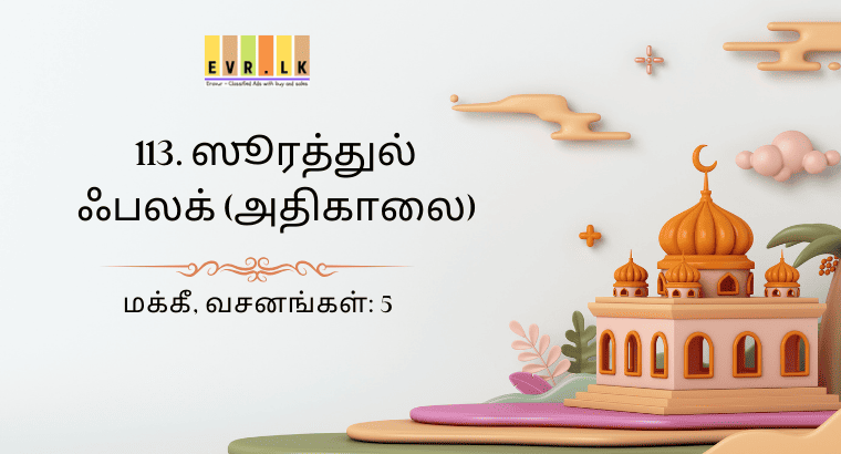 மக்கீ, வசனங்கள்: 5 بِسْمِ اللهِ الرَّحْمٰنِ الرَّحِيْمِ அளவற்ற அருளாளனும், நிகரற்ற அன்புடையோனுமாகிய அல்லாஹ்வின் திருப்பெயரால்(துவங்குகிறேன்) 113:1 قُلْ اَعُوْذُ بِرَبِّ الْفَلَقِۙ (நபியே!) நீர்…